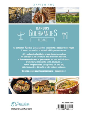 La nouvelle collection Randos Gourmandes vous invite à découvrir une région à travers ses sentiers et ses spécialités gastronomiques ! Des guides richement illustrés dans lesquel l'auteur a sélectionné des arrêts gourmands sur ou à proximité directe du parcours : producteurs, restaurants ou bistrots proposant une cuisine typique et locale, marchés, vignobles... À mettre entre les mains des marcheurs « épicurieux » ! Randos Gourmandes Alsace vous invite à explorer, à travers 25 balades familiales ou sportives, les paysages et les saveurs des départements du Haut-Rhin et du Bas-Rhin : outre les emblématiques vins d'Alsace et les tartes flambées, dégustez un délicieux pain d'épices au pied du mont Saint-Odile, fondez pour le miel des Vosges du Nord ou encore pour le foie gras d'Alsace IGP de la Maison Metzler à Gueberschwirh. L'Auteur : Après avoir exercé différents métiers, Xavier Hug est aujourd'hui paysan-vigneron dans la Drôme. Il a déjà publié chez Chamina Edition Baignades dans la Drôme et Baignades en Ardèche. Pour Randos Gourmandes Alsace, c'est avec plaisir qu'il est revenu sur ses terres natales afin d'élaborer ce guide alléchant ! Les + produit : - 25 circuits de longueur variable entièrement repérés par l'auteur dont deux circuits en ville (Strasbourg, Colmar) et 1 circuit à vélo - Des points gourmands sur ou a proximité directe des itinéraires avec toutes les infos pratiques (adresse, téléphone, horaires, prix) - Cartographie sur fond IGN au 1 :25 000 pour se repérer facilement - Détail des centres d'intérêts