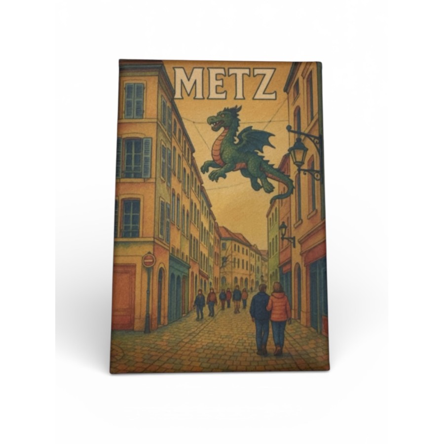 Ramenez un petit bout de Metz à la maison avec ce magnet rectangulaire illustrant la célèbre rue Taison et le légendaire Graoully. Un souvenir local plein de charme, parfait pour décorer un frigo, une surface métallique ou compléter une collection de magnets ✨🐉