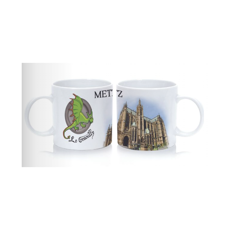 La tasse expresso Graoully & Cathédrale de Metz met en valeur deux symboles emblématiques de la ville sur un fond blanc sobre et intemporel. Compacte et idéale pour les expressos, elle apporte une note locale à vos pauses café, à la maison comme au bureau. Un indispensable pour les amoureux de Metz et les collectionneurs de souvenirs.