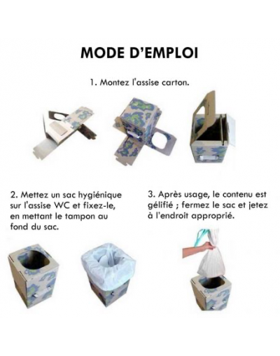 Ces WC portatifs sont un système pliable conçu en carton rigidifié pour supporter un poids jusqu'à 115 kg.