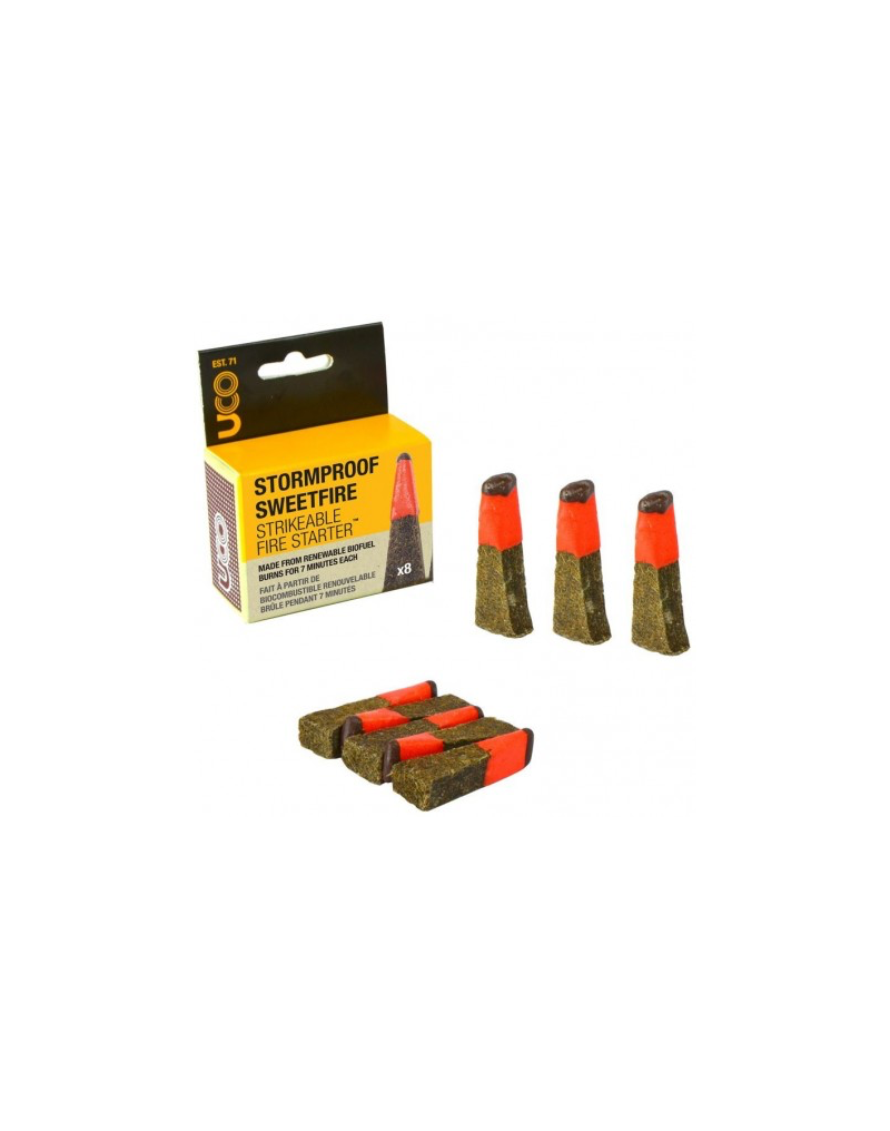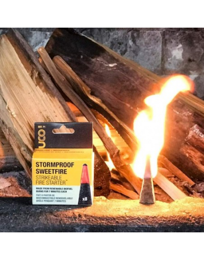 Les allumettes UCO Stormproof Sweetfire font office à la fois d'allumettes étanches et d'allume-feu de survie avec une durée de combustion de 7 minutes par allumette. Elles continuent de fonctionner même si elles sont mises sous l'eau ou sous le vent. Conçues à partir de canne à sucre, les allumettes Sweetfire sont écologiques, puissantes et vendues par lot de 8. Poids : 60 g. Longueur : 6 cm.