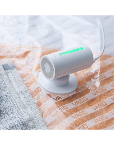 Le compresseur de voyage Vago est l'accessoire idéal pour réduire le volume de vos bagages et protéger vos vêtements. Très petit, cette pompe à vide se branche via câble USB d'un côté et sur votre sac de compression Vago de l'autre : il fait le vide d'air et permet de réduire de 50% la taille de vos affaires.