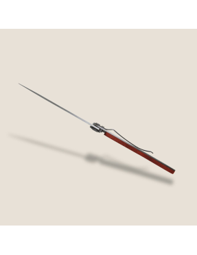 Le manche en bois corail, vif et chaleureux, apporte une note exotique et contemporaine qui contraste joliment avec la sobriété de la lame.