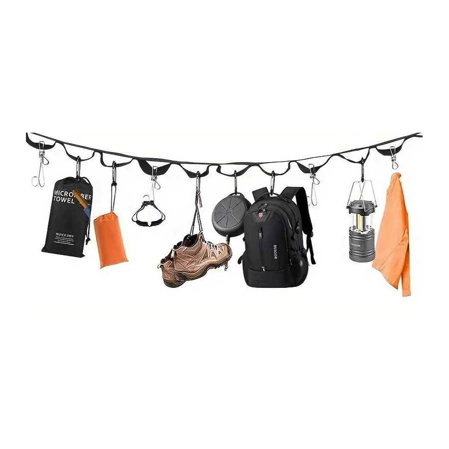 Équipée de 19 mousquetons, elle permet de suspendre rapidement vos accessoires : lampe, gourde, ustensiles, vêtements ou matériel de camping. Les anneaux de fixation aux extrémités assurent une installation rapide et sécurisée.