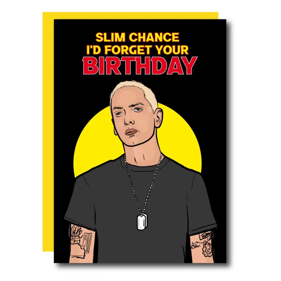 La carte d’anniversaire “Slim Chance Rapper” (Eminem) mélange humour, nostalgie et style urbain.