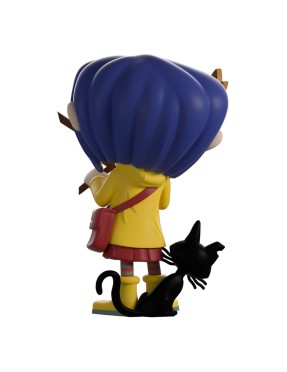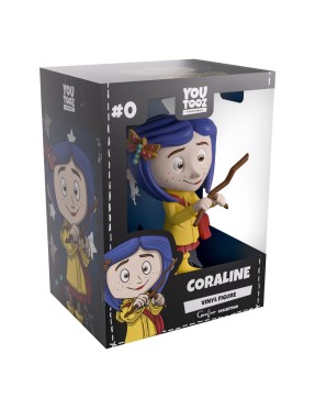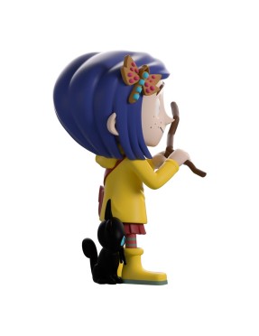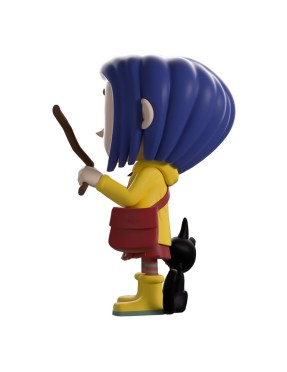 La figurine Youtooz Coraline représente la jeune aventurière avec son ciré jaune iconique, ses bottes assorties et son chat noir à ses côtés. Elle tient une baguette de sourcier et affiche son style reconnaissable avec ses cheveux bleus et sa barrette.